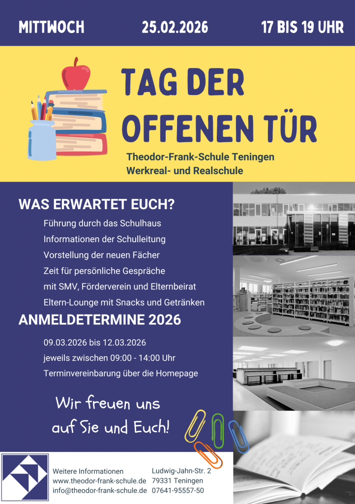 Herzlich Willkommen auf der Internetseite der Theodor-Frank-Schule Teningen. Wir sind eine Verbundschule aus Realschule und Werkrealschule und bieten neben dem Hauptschulabschluss auch den Werkrealschulabschluss und den Realschulabschluss an. Zur Zeit besuchen über 600 Schülerinnen und Schüler die von über 50 engagierten Pädagoginnen und Pädagogen unterrichtet und begleitet werden.